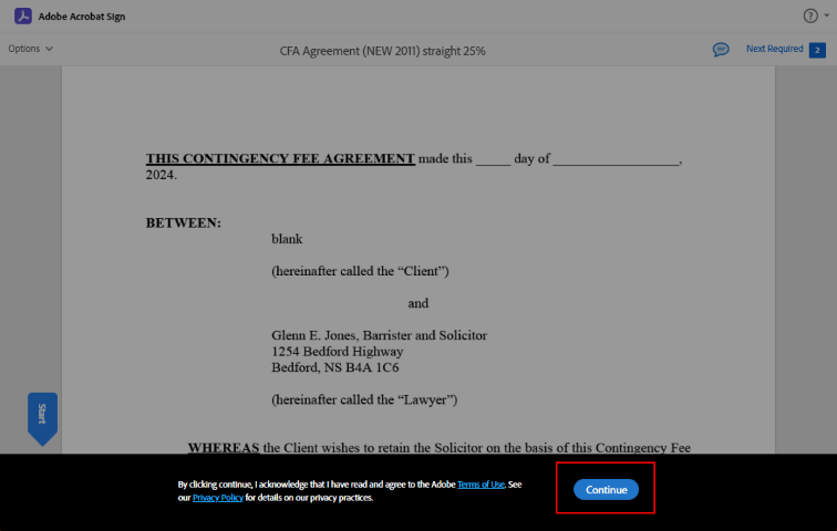 Click Continue to agree to Terms and Conditions followed by Next Required Field